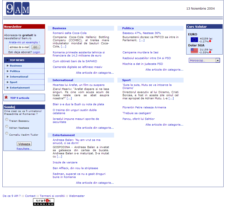Gandit pentru personalizare, pentru cititor in zonele de larg interes: subiectele si temele zilei, vremeahoroscop, curs valutar etc., 9AM ramane instrumentul preferat pentru informarea despre agenda zilei, desfasurarea acesteia si rezumatul evenimentelor importante.