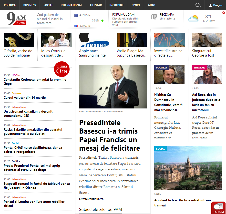 9AM iti prezinta zilnic informatii de ultima ora, topuri, stirile zilei, horoscopul personalizat, prognoza meteo si comentariile celor direct interesati despre evenimentele curente.